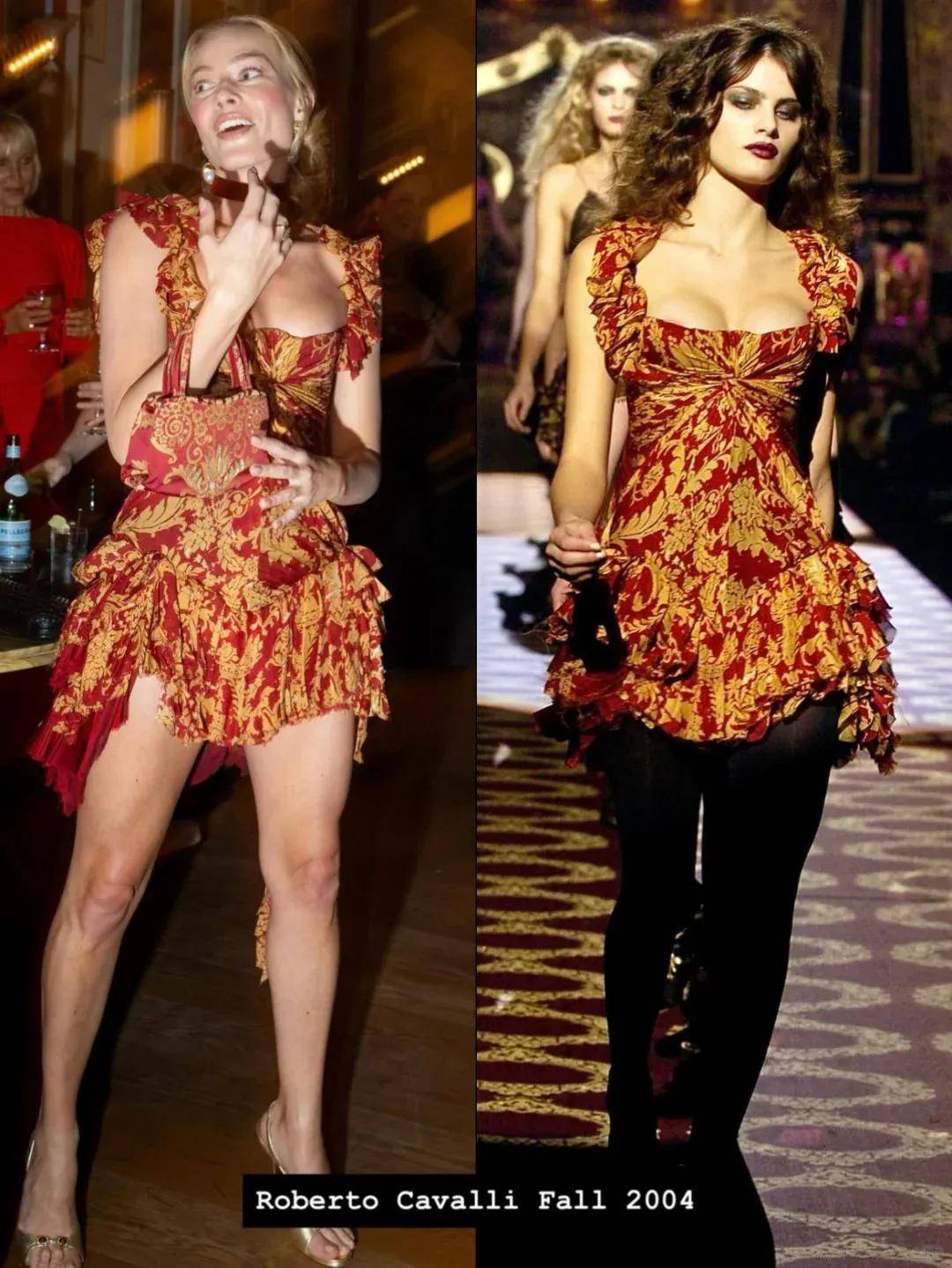 《呼啸山庄》洛杉矶首映After Party的活动中,Margot上身了一件来自Roberto Cavalli 2004秋冬系列的红金色短裙,色彩浓烈又富有层次,紧身低胸廓形勾勒曲线,荷叶边设计凸显灵动。
