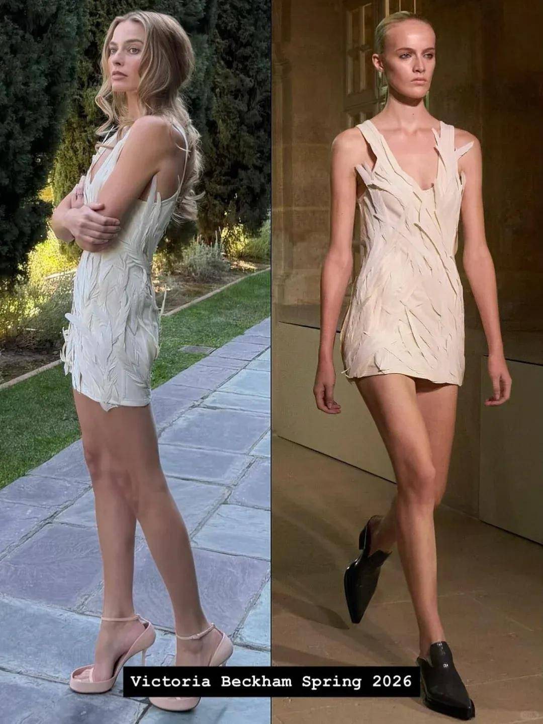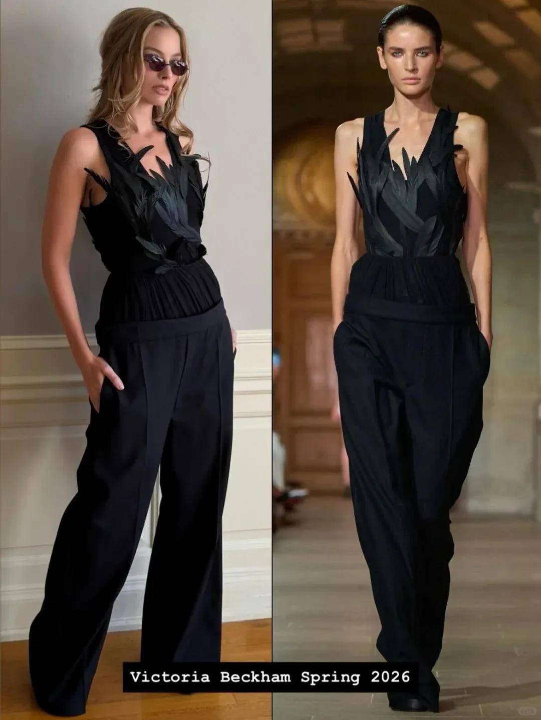 Margot Robbie的宣传造型中还出现了中国设计师的作品,这套黑色网纱抹胸裙、粉色碎花抹胸连衣裙和及膝绑带高跟鞋均来自MARKGONG 2026春夏系列,这是中国设计师龚子铭(Mark Gong)2018年创立的同名品牌,破碎感和性张力十足。