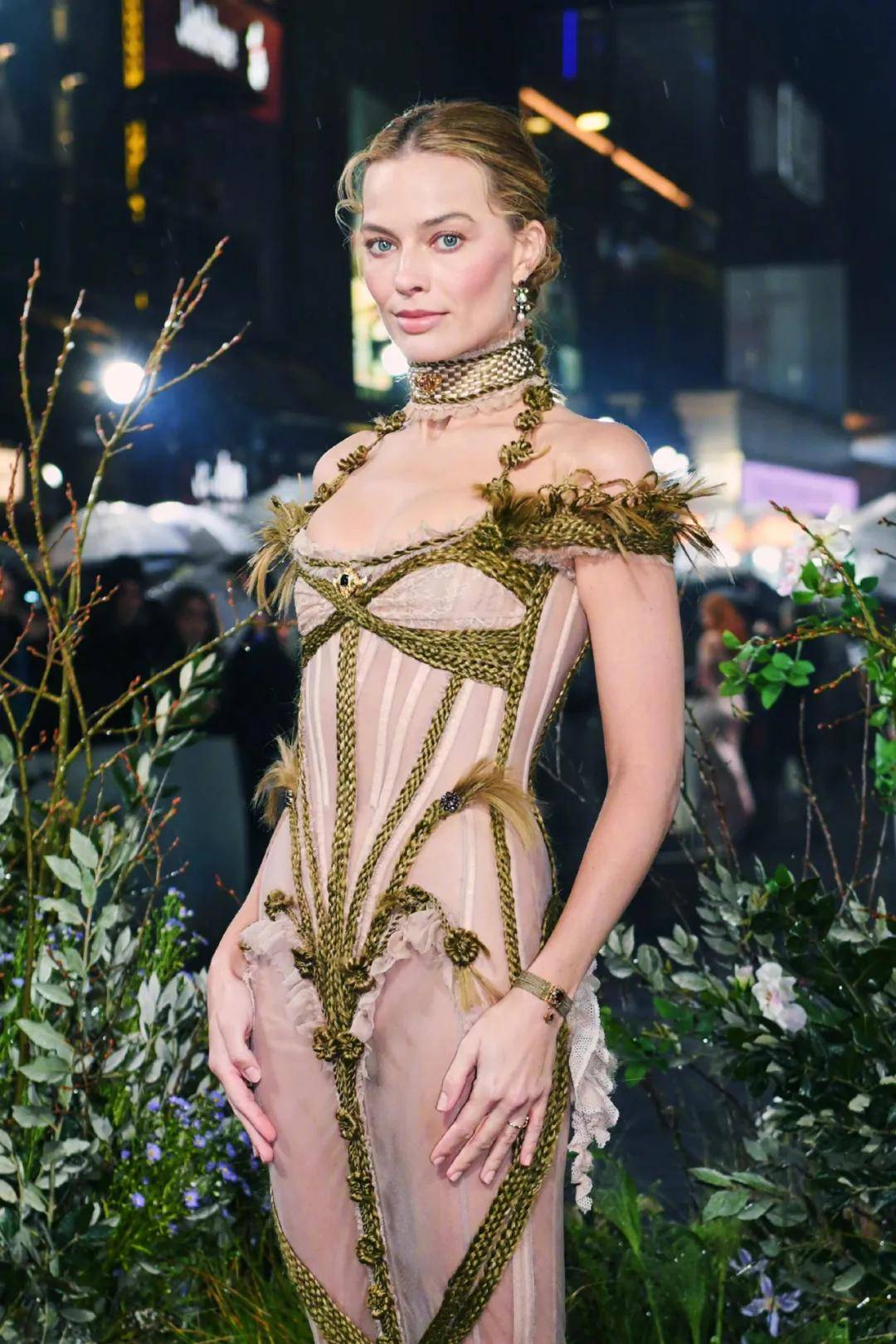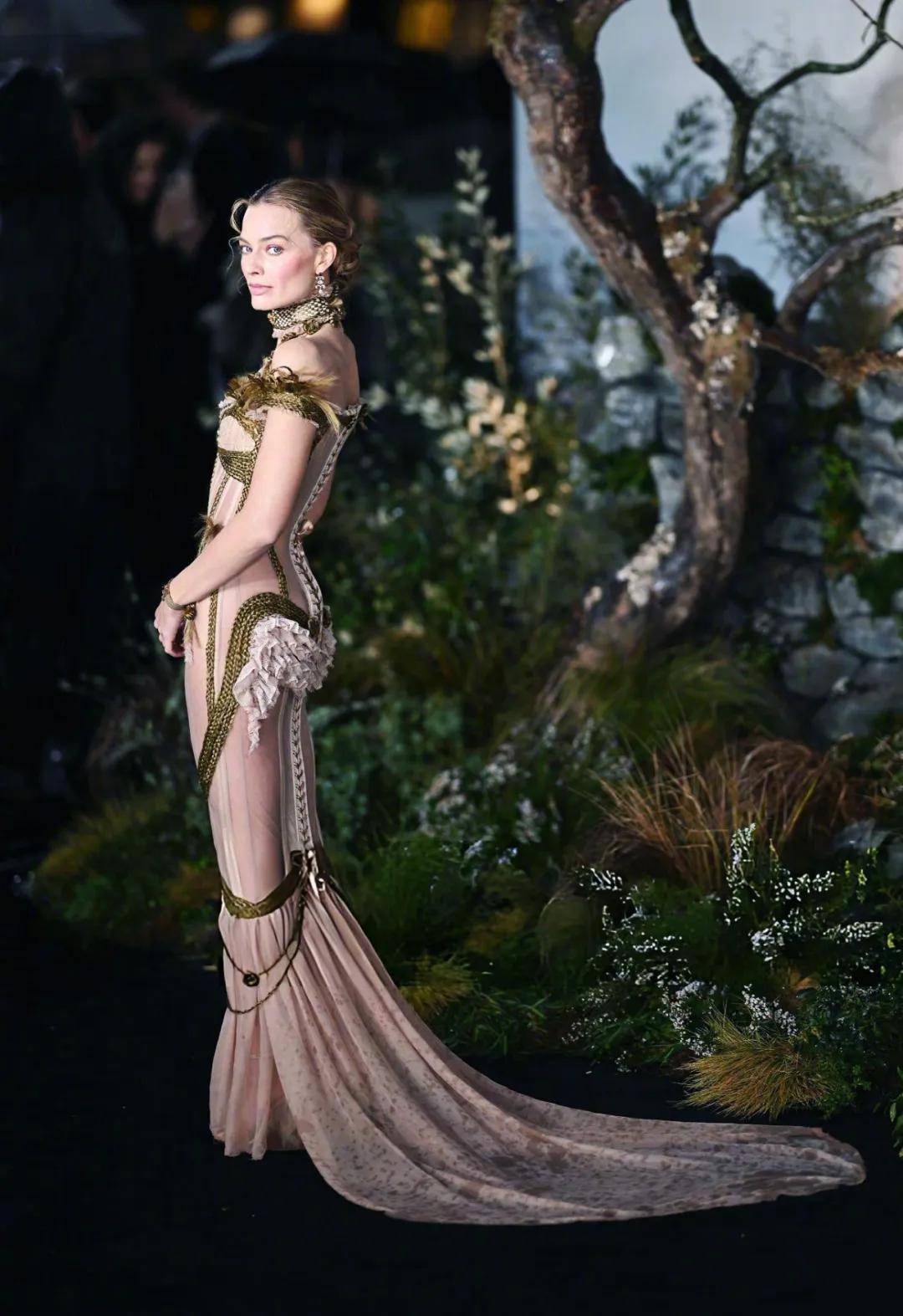 2月12日在悉尼出席《呼啸山庄》澳洲首映礼时,Margot Robbie上身来自Ashi Studio特别定制的透视裙,18世纪风靡的绑带束胸衣元素与薄纱、锈迹、破碎毛边等细节叠加,让她整个人都散发出浓郁的哥特风情。