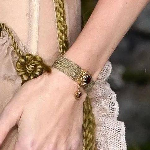 Margot Robbie 的手腕上也佩戴了由勃朗特故居所在地——霍沃斯家族工坊 Wyedean Weaving制作的复刻版手镯,以致敬原著作者。